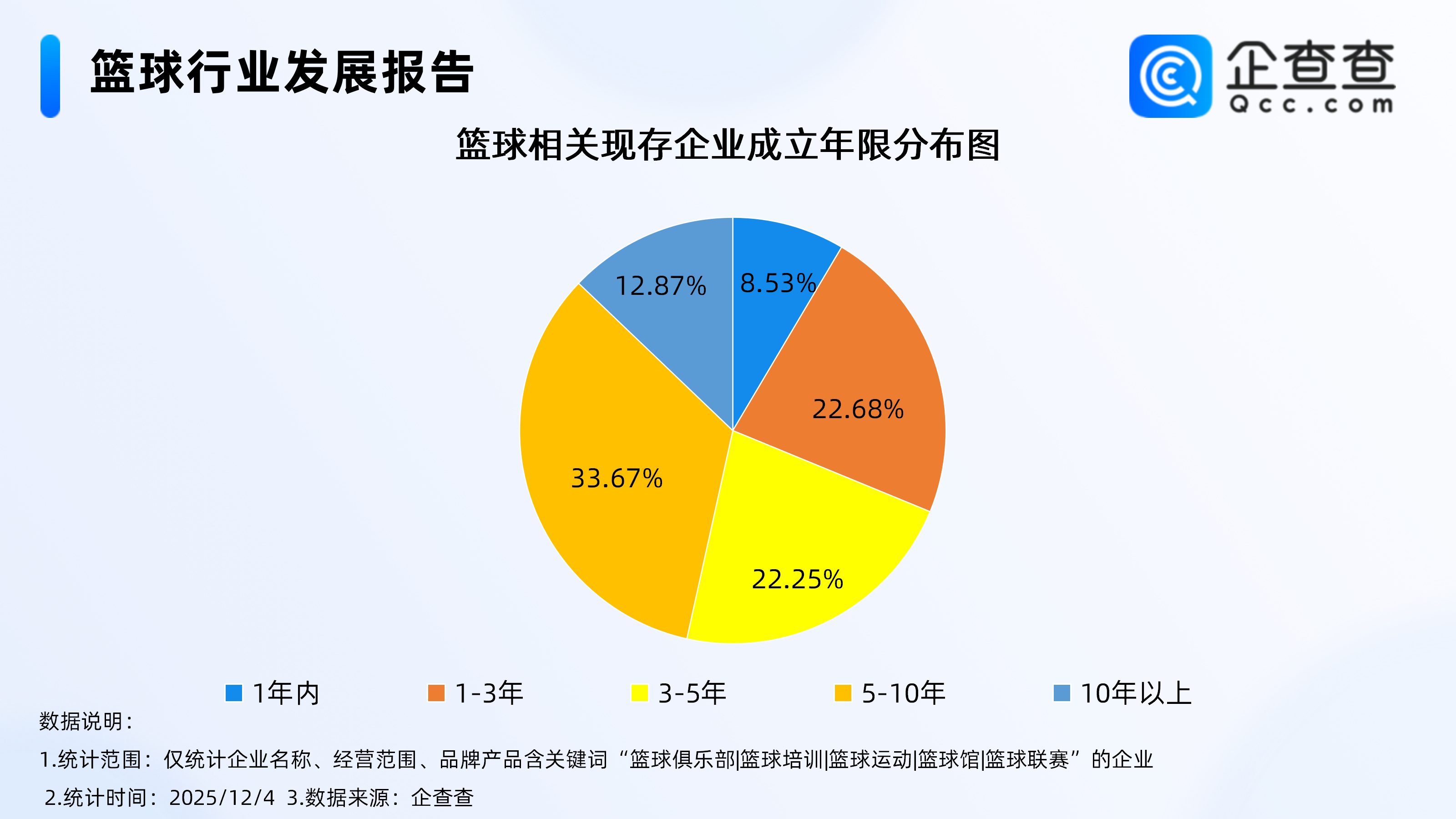 企查查数据显示,截至12月4日,国内篮球相关企业现存量达1.03万家,主要分布在华东地区,占比达32.11%,其次为分布在华南地区的相关企业,占比达17.33%。分布在华北、华中、西南这三个地区的相关企业量相对均衡,占比均在11%-13%之间。2、超3成相关企业成立年限在5-10年